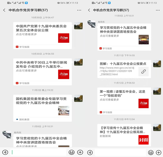 第一時(shí)間利用微信群宣貫十九屆五中全會精神。10月30日,中機(jī)合作即在公司黨員學(xué)習(xí)群轉(zhuǎn)發(fā)《中國共產(chǎn)黨第十九屆中央委員會第五次全體會議公報(bào)》。11月8日,轉(zhuǎn)發(fā)學(xué)習(xí)貫徹黨的十九屆五中全會精神中央宣講團(tuán)首場報(bào)告會視頻,11日、12日,又分別轉(zhuǎn)發(fā)《圖解:十九屆五中全會公報(bào)要點(diǎn)》《第一觀察|讀懂五中全會,這是一個(gè)“導(dǎo)航密碼”》《十九屆五中全會公報(bào)高頻詞解析》等等,指導(dǎo)廣大黨員學(xué)習(xí)十九屆五中全會精神。